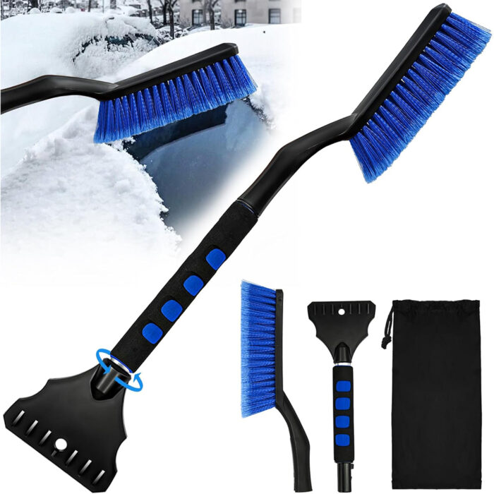 Glava četke se rotira, što olakšava korištenje pod različitim uglovima — idealno za visoka vozila, SUV modele i kombije. Strugač je izrađen od tvrde, otporne plastike, pa lako skida zaleđene naslage čak i pri najnižim temperaturama. Lagana je, kompaktna i dolazi s torbicom, tako da se može uvijek držati u gepeku ili vratima vozila.