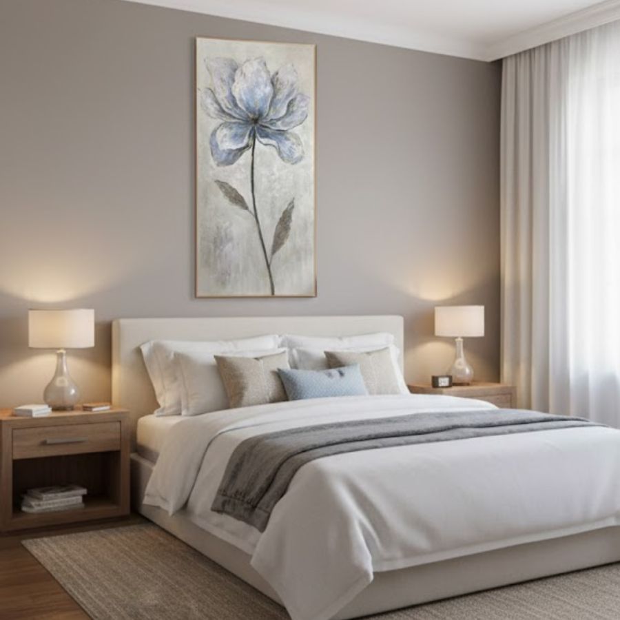 Dekorativna slika cvijeta je savršen izbor kada želite nježan, ali primjetan zidni detalj koji se lako uklapa u različite stilove uređenja. Ova dekorativna slika cvijeta donosi profinjen motiv velikog cvijeta u neutralnim, sivim i plavo-srebrnim tonovima, uz diskretnu pozadinu koja prostoru daje mir i eleganciju.