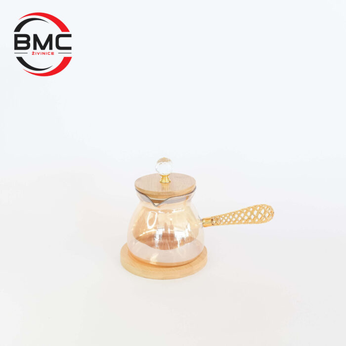Tijelo koje ima Džezva Za Kafu izrađeno je od prozirnog, toplinski otpornog stakla, pa se lako pere i ne zadržava mirise. Drveni poklopac i podloška daju prirodan, topao utisak i lijepo se uklapaju u moderne i klasične kuhinje. Zlatna ručka sa detaljno izrađenom mrežastom strukturom ne samo da izgleda luksuzno, već sprečava klizanje iz ruke. Upravo taj spoj stakla, drveta i metala čini da Džezva Za Kafu izgleda kao mali dizajnerski komad na vašem stolu.