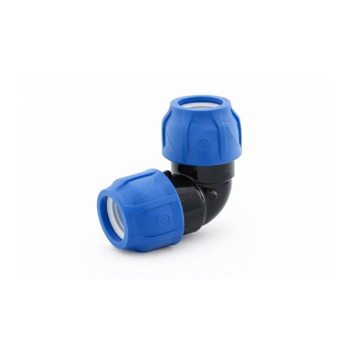 Na osnovu dostavljene fotografije vidi se kompresiona izvedba sa dva priključka i ugaonim tijelom koje omogućava skretanje voda bez nepotrebnog komplikovanja instalacije. Takav oblik je tipičan za kompresione fitinge koji se koriste uz PEHD cijevi, posebno tamo gdje su važni brza montaža i pouzdan spoj. BM Company kod srodnog proizvoda Koljeno PVC UN navodi da ovakav tip elementa služi za sigurnu promjenu pravca toka za 90 stepeni te omogućava brzu i pouzdanu montažu bez zavarivanja ili ljepila, što se prirodno podudara sa namjenom ovog artikla.
