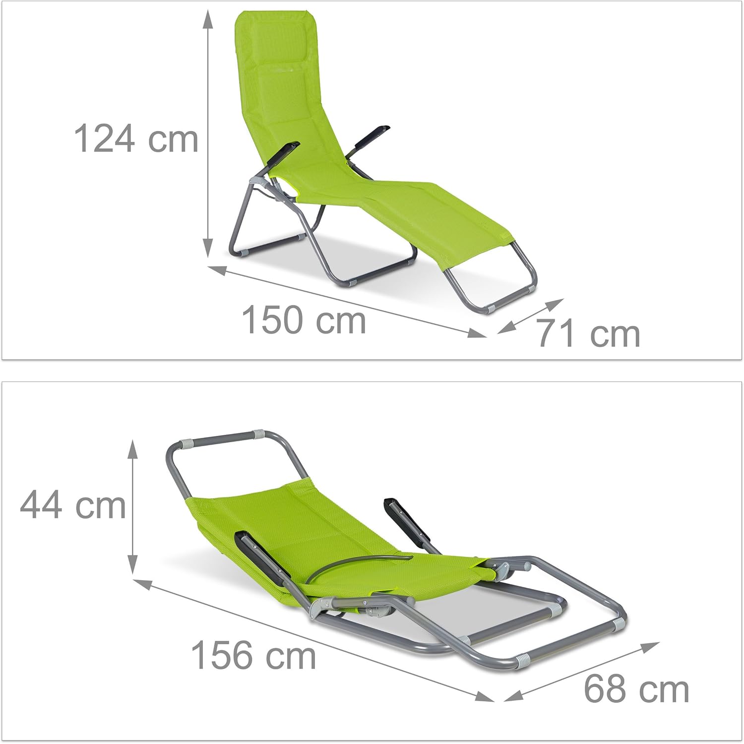Dimenzije sa slike pokazuju da ležaljka za plažu nudi dovoljno prostora za opuštenije korištenje. U uspravljenijem položaju dimenzije su približno 124 x 150 x 71 cm, dok u nižem položaju iznose približno 44 x 156 x 68 cm. Upravo takva izvedba doprinosi boljem osjećaju komfora i čini ovu ležaljku za plažu korisnim izborom za odmor tokom toplijih dana.