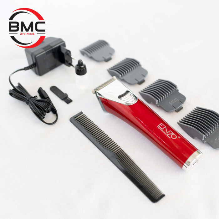 Elegantna ENZO mašina za šišanje s punjivom baterijom, setom nastavaka i pratećim priborom – idealna za precizno šišanje i uređivanje frizure kod kuće ili u salonu.