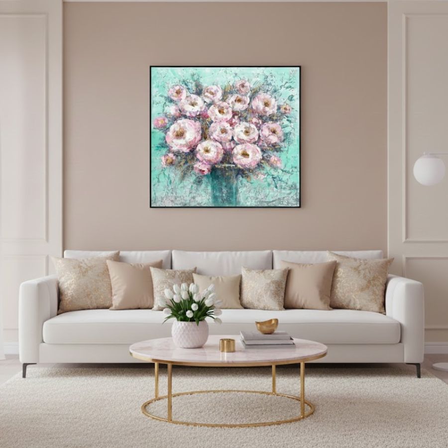 Dekorativna slika cvjetnog buketa je savršen izbor kada želite unijeti svježinu, nježnost i moderan stil u prostor. Ova moderna dekorativna slika cvjetnog buketa u formatu 80×80 cm ističe se bogatim, slikarskim potezima i skladnim pastelno-cvjetnim tonovima koji se lako uklapaju u različite enterijere – od minimalističkih, do toplih porodičnih ambijenata.