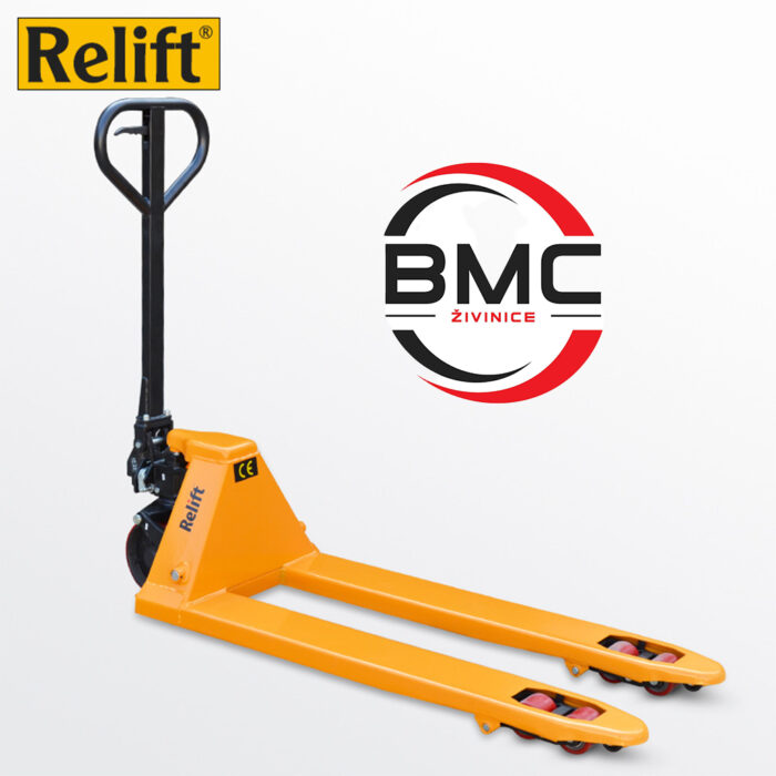 BMC ručni paletar nosivosti 2500 kg namijenjen je za lako i sigurno premještanje paleta u skladištima, trgovinama i industrijskim prostorima. Sa robusnom čeličnom konstrukcijom, PU točkovima (otporni na habanje) i standardnim dimenzijama viljuški, ovaj model pruža pouzdanost, dug vijek trajanja i jednostavno rukovanje.