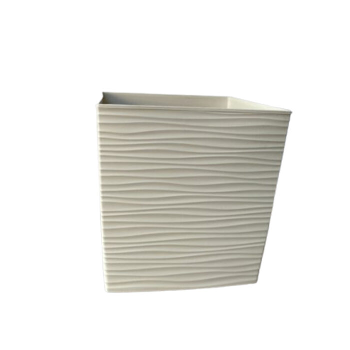 Kvadratna plastična saksija s valovitom teksturom, pogodna za unutrašnju i vanjsku upotrebu. Zahvaljujući otpornosti na UV zrake i vlagu, idealna je za balkone, terase, dvorišta i kućne prostorije.