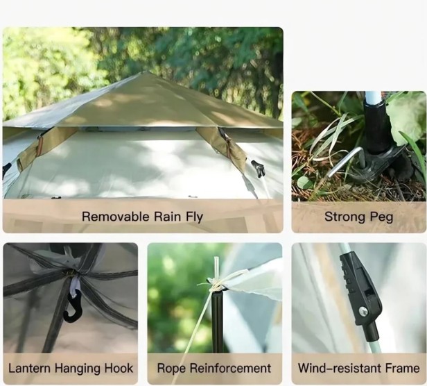 Izrađen je od kvalitetnog 210D Oxford ripstop poliestera sa PU1000 mm vodootpornim premazom, koji štiti od lagane kiše, rose i vlage. Potpuno prekrivajuća tenda pruža dodatnu zaštitu od sunca i vremenskih uslova. Ojačana konstrukcija i 12 klinova osiguravaju stabilnost čak i pri jačim naletima vjetra.