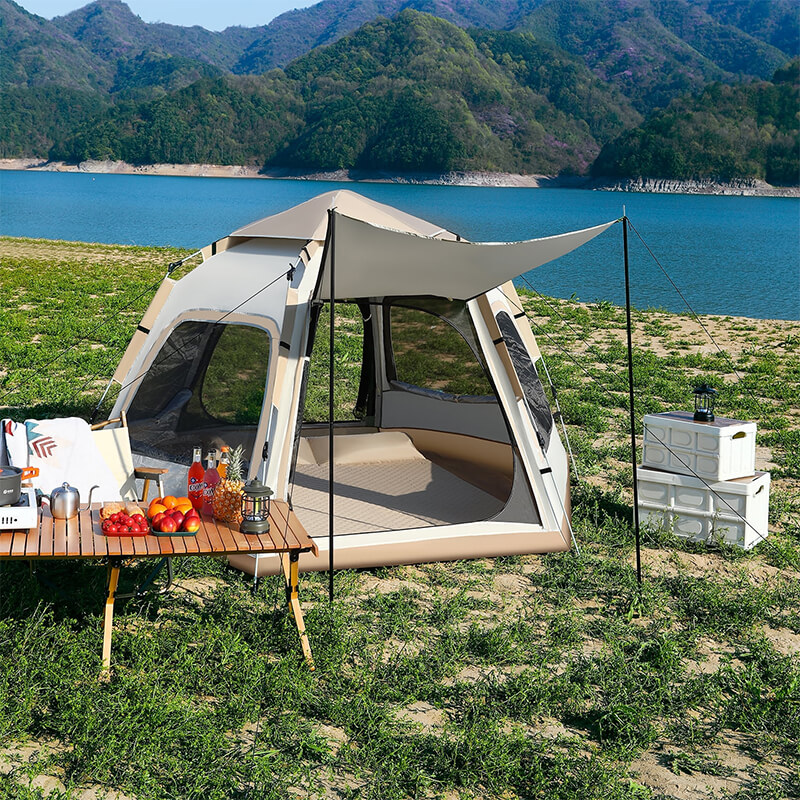 Automatski porodični šator za do 4-6 osobe sa pop-up hidrauličnim sistemom. Vodootporni 210D Oxford materijal, mrežasta vrata, stabilna konstrukcija i torba za nošenje.