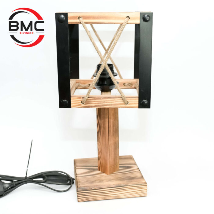 Stolna lampa ručne izrade u industrijskom stilu, kombinacija prirodnog drveta, metala i dekorativnog užeta. Idealna kao noćna, radna ili dekorativna lampa za dnevni boravak, spavaću sobu, kancelariju ili kafić. Dostava 24–48 sati širom BiH.
