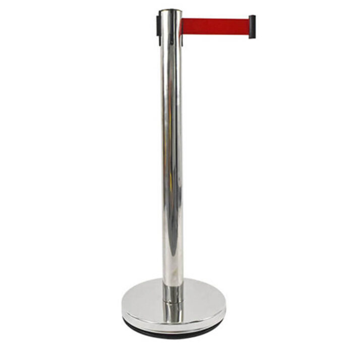 Ukrasni stub sa crvenom trakom od nehrđajućeg čelika (INOX), visine 90 cm i trakom dužine 2,5 m. Idealan za odvajanje prostora i formiranje redova u butikima, bankama, restoranima, hotelima, salama za vjenčanja i svim vrstama događaja.