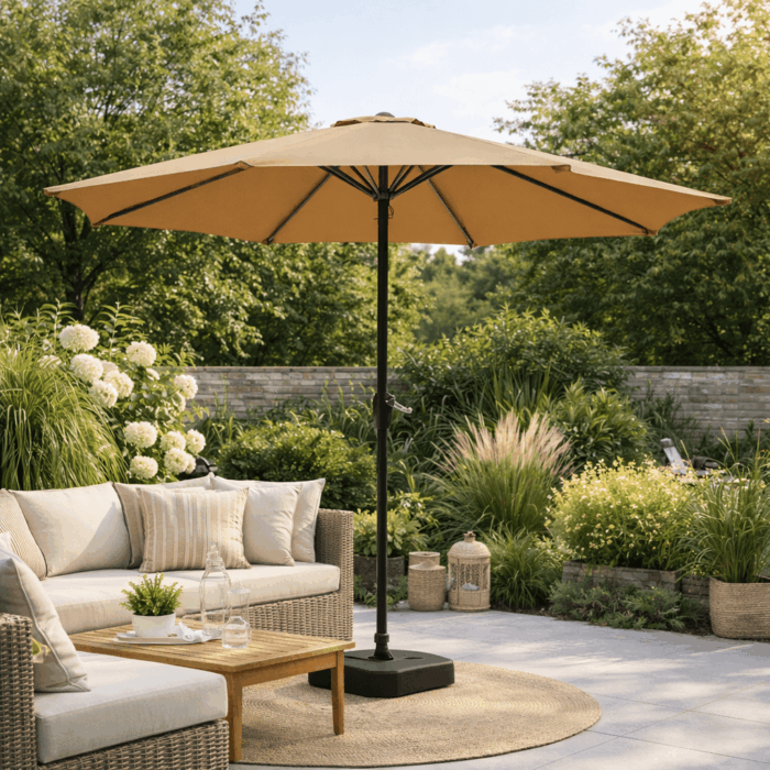 Moderan i neutralan dizajn omogućava da se suncobran lako uklopi uz vrtni namještaj i vanjski ambijent. Dostupan je u dvije popularne boje za BIH tržište – bež i zelena, koje se savršeno uklapaju u prirodni prostor dvorišta i bašte.