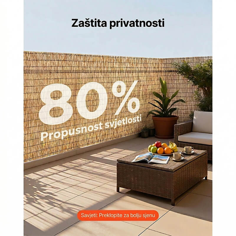 Dodatna prednost je i sama zasjena. Ograda od trstike sa oko 80% zasjene pomaže da prostor bude intimniji i ugodniji za boravak, a pritom i dalje zadržava prirodan izgled i laganiju prozračnost. Takvo rješenje je vrlo korisno za korisnike koji žele zaštitu od pogleda susjeda, malo više hlada i dekorativan element koji neće djelovati hladno ili industrijski.