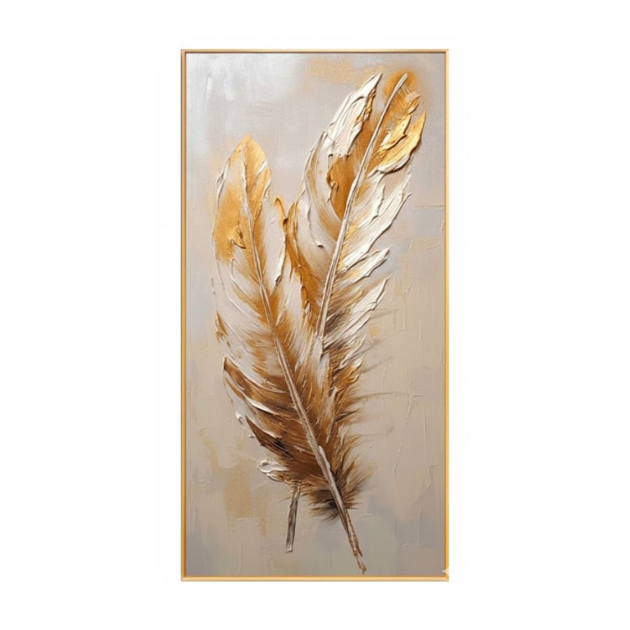 Dostupne su dvije varijante dimenzija, kako biste lakše uklopili sliku zlatnog perja u svoj prostor. Motiv na fotografiji prikazuje dekorativni prikaz zlatnih pera na neutralnoj podlozi, sa izraženim umjetničkim potezima koji daju dojam teksture.