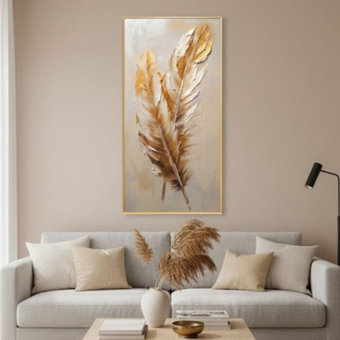 Unesite sofisticiranu toplinu u svoj enterijer uz sliku zlatnog perja – dekorativni motiv koji spaja eleganciju zlatnih akcenata i smirene, neutralne nijanse. Ova slika zlatnog perja je idealan izbor kada želite da zid dobije premium izgled, bez prenatrpanih detalja. Zahvaljujući vertikalnom formatu, slika zlatnog perja posebno lijepo izgleda iznad komode, sofe, u hodniku ili u poslovnim prostorima (recepcija, kancelarija, salon).