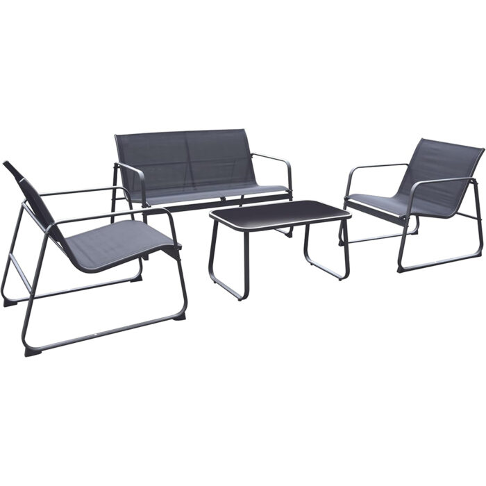 Izrađena je od čvrstog metalnog okvira i visokokvalitetne tekstilene mreže otporne na vremenske uslove, što garantuje dugotrajnu stabilnost i udoban osjećaj pri sjedenju. Set se lako održava, ne zahtijeva specijalnu njegu, a moderan minimalistički izgled lako se uklapa u bilo koji vanjski ambijent.