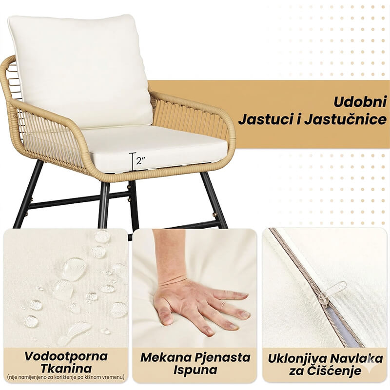 Ono što ovu vrtnu garnituru 5/1 čini posebno privlačnom jeste spoj udobnosti i funkcionalnosti. Prostrana sjedišta i deblji jastuci doprinose ugodnijem sjedenju tokom kafe, odmora, porodičnog druženja ili večernjeg opuštanja na otvorenom. Prema dostavljenim informacijama, navlake na jastucima se mogu skidati, što olakšava održavanje i čini garnituru praktičnijom za svakodnevnu upotrebu.