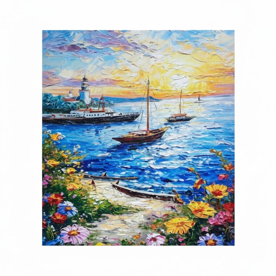 | Motiv | Morski pejzaž (more, brodovi/jedrilice, svjetionik, zalazak sunca) |