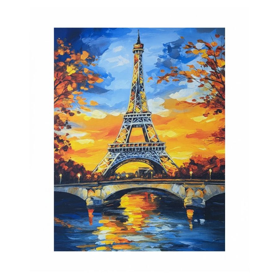 Zidno platno sa motivom Ajfelovog tornja je dekorativno rješenje za moderan i klasičan enterijer – spoj prepoznatljivog pariškog simbola, toplih tonova zalaska sunca i umjetničkog “paint” efekta koji prostoru daje dubinu i karakter. Ovo zidno platno sa motivom Ajfelovog tornja posebno se ističe živim kontrastom plave rijeke i zlatno-narandžastog neba, uz detalje mosta i jesenjih krošnji.