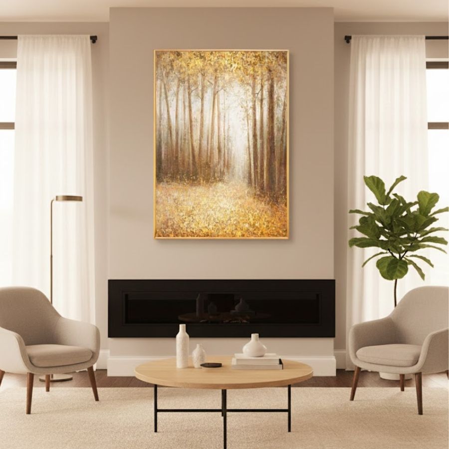Zlatna Šuma slika posebno dobro izgleda u prostorima sa neutralnim bojama (bijela, siva, bež), drvenim detaljima i toplom rasvjetom. Kao slika šume i zidna slika prirode, odlično se kombinuje sa zlatnim ili crnim dekorativnim elementima, te minimalističkim namještajem. U većim prostorijama preporučena je varijanta 80×120 cm, dok je 60×90 cm odlična za uže zidove i manje ambijente.